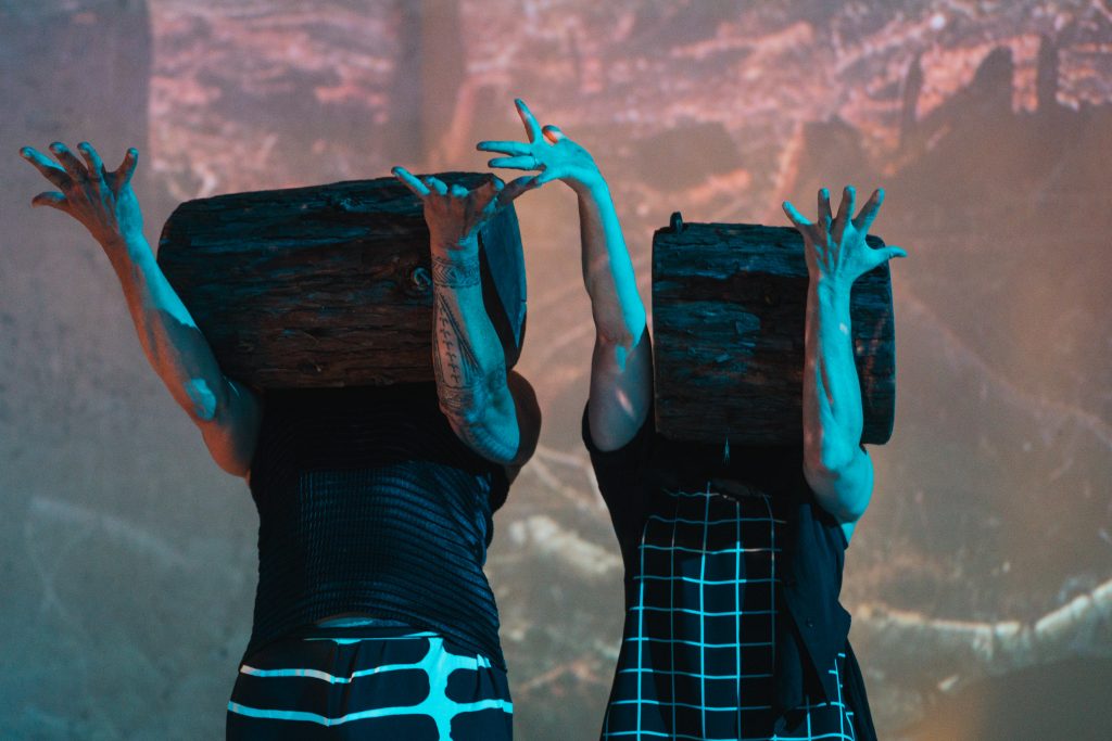 Image Description: The image shows two performers standing side by side, each with a large log positioned over their heads, obscuring their faces. Their arms are raised dramatically, fingers splayed in expressive poses. One performer has visible tattoos on their arm and is wearing a black top with patterned pants featuring white shapes, while the other wears a black outfit with a white grid pattern. The lighting casts a bluish hue, giving the scene a surreal or theatrical feel, and the background appears to be a projection or textured surface with warm tones. The overall composition evokes a sense of performance art or abstract expression.